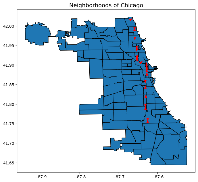 Once I had the CTA data, I ran into a new problem: how to plot it on a map? I spent several days exploring different options. I started with GeoPandas, a library I was familiar with, and a shapefile of Chicago’s neighborhoods.